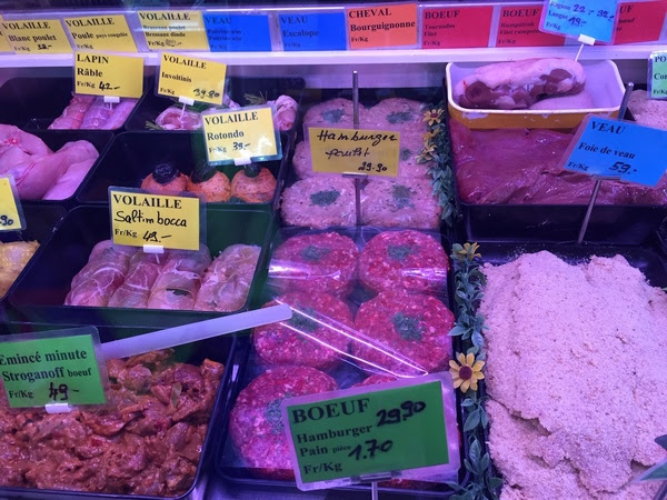 Entrar a una carnicería en Suiza es como ir a una dulcería. Jamón de pierna, ternera empanizada, pechugas de pollo y salchichones apetitosos te dan la bienvenida. Brilla, huele rico y dan ganas de nunca ser vegetariana. Todo está tan bien presentado, incluyendo al señor carnicero, que casi lo pido envuelto y para llevar.